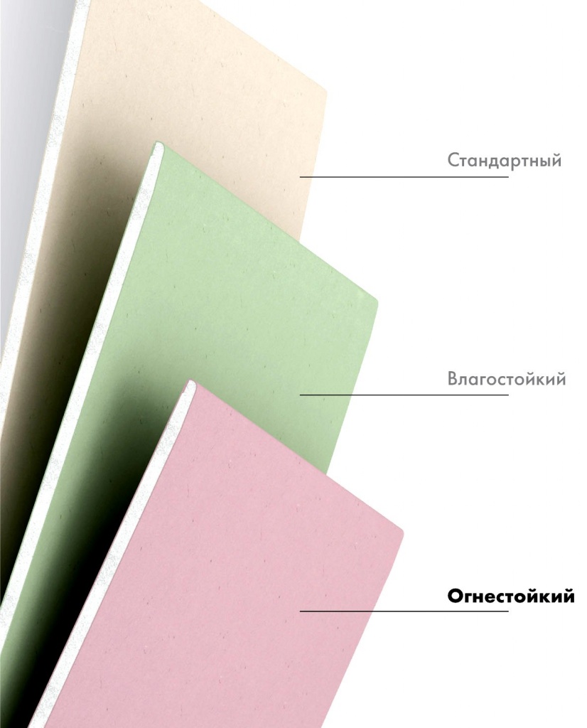 - Огнестойкий гипсокартон (ГКЛО) пригоден для помещений с высоким уровнем возможности возникновения пожароопасных ситуаций. Его листы содержат минеральные волокна и различные добавки, которые увеличивают уровень огнестойкости материала. Узнать его можно по картону красного цвета. Этот вариант будет уместен при облицовке, наприимер, телекоммуникаций.