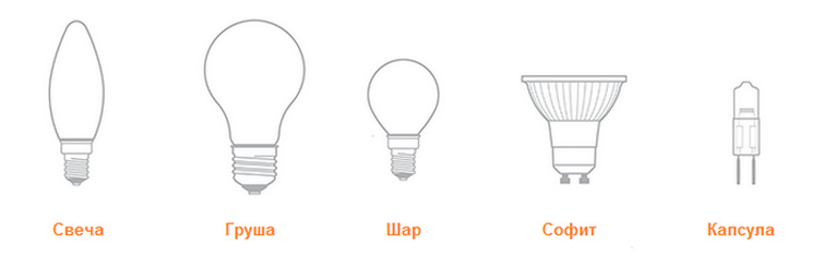 Светодиодные лампы повторяют все возможные виды ламп накаливания, галогенных и люминесцентных ламп. Выпускаются обычные лампы-"груши", "свечки" и "шарики" с цоколями E27 и E14, "зеркальные" лампы R39, R50 с цоколями E14, и R63 с цоколем E27, споты с цоколями GU10 и GU5.3, капсульные микролампы с цоколями G4 и G9, лампы для потолков с цоколем GX53.