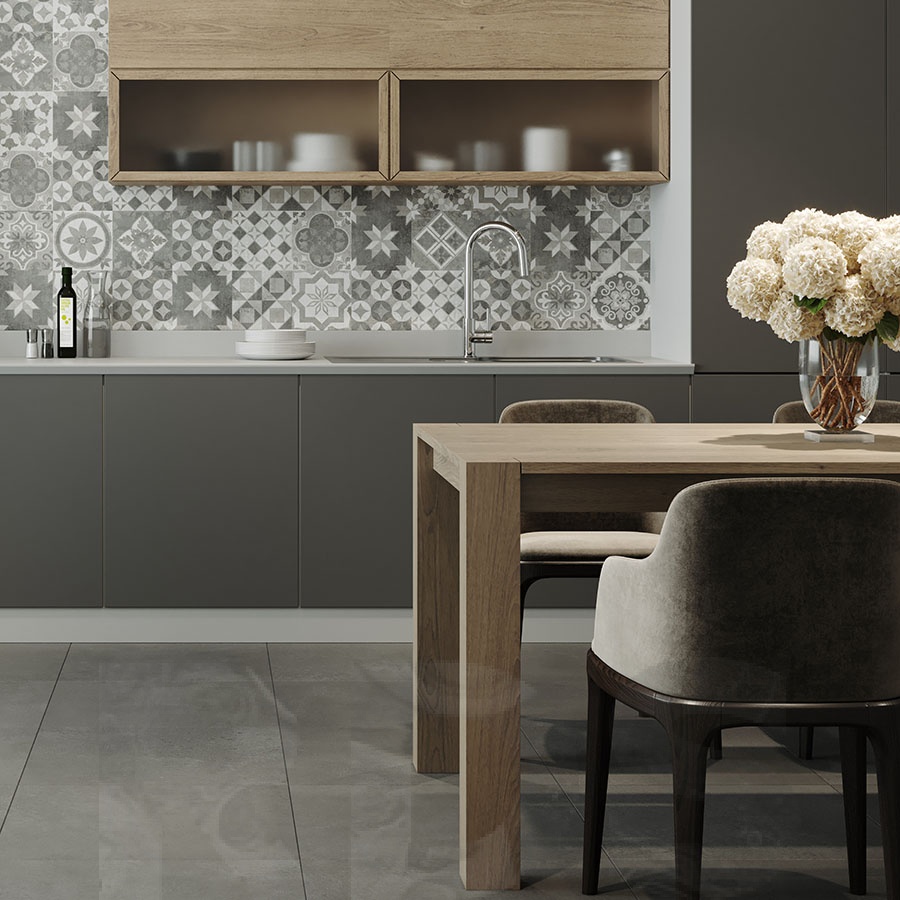 Серый цвет у керамогранита относится бело-черной гамме. Это нейтральный окрас, который не вносит эмоциональной насыщенности, не создает индивидуальных образов, но в качестве фона он незаменим. Его используют для любых интерьеров.