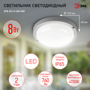 Светодиодный светильник SPB-21-0-40K-08 ЭРА - универсальный пылевлагозащищённый LED-светильник для освещения помещений с повышенной влажностью, лестничных клеток, балконов, подвалов, технических и подсобных помещений. А также для бытового использования над крыльцом, на балконе, в подвале, в хозблоке, в гараже.