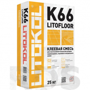 Litofloor K66 - клей для напольной и настенной облицовки любым видом керамической плитки, керамогранита и устойчивого к влажности натурального камня размером до 120x60 см, не требующий предварительного выравнивания основания. Для внутренних и наружных работ.
