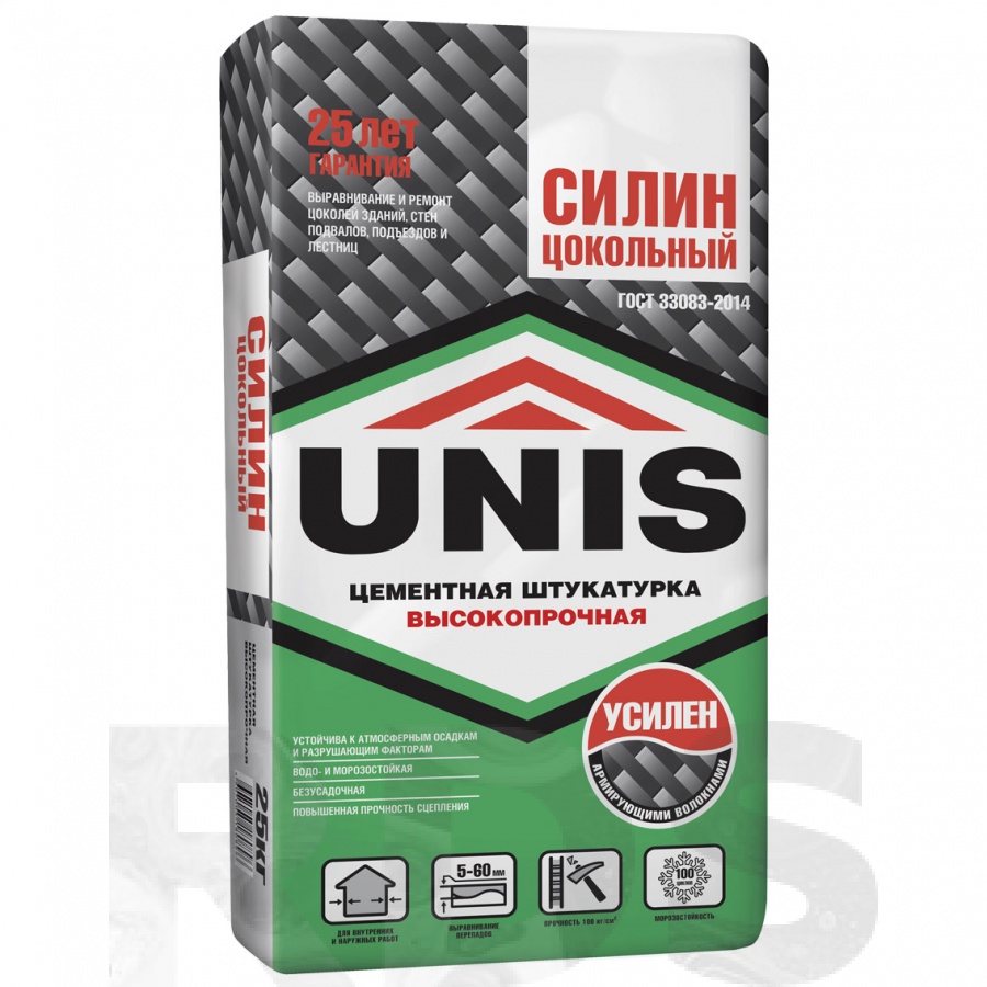 Штукатурка цементная Unis Силин Цокольный применяется для выравнивания и защиты поверхностей, подверженных повышенному воздействию агрессивных сред и разрушающих факторов (цоколей зданий, наружных подъездов, цоколей, лестниц) без штукатурной сетки слоем до 30 мм; для ремонта сколов, выбоин, раковин, трещин до 60 мм, заполнения стыков ЖБИ.